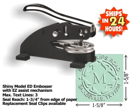 Our latest POCKET Style LOGO Embossing seal (1-5/8in. diameter die plates) with your choice of 15 message lines and 10 stock images. Add your own logo for an additional $40. Standard throat allows for an impression reach up to 1-3/4in. from edge of paper.