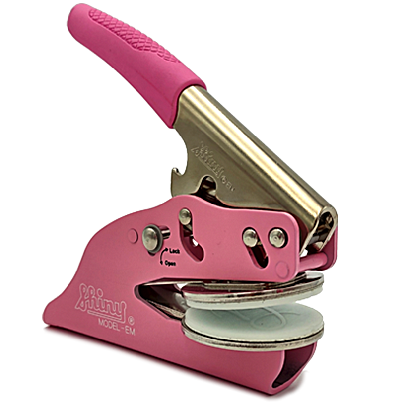 Our new Pink Finish Shiny® POCKET Style Embossing seal (1-5/8in. diameter die plates) with a compact clamshell storage case included. Standard throat allows for an impression reach up to 1-3/4in. from edge of paper. Normal production time is 24 - 48 hours (excludes weekends and holidays)