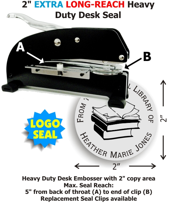 Our heaviest duty Desk Style EXTRA Long-Reach LOGO Embossing seal with your choice of 15 message lines and 10 stock images. 2in. diameter die plates (max. impression area). Extremely heavy guage metal and sturdy rubber feet provide a superior platform for high volume embossing jobs. The longest die holder available on the market provides the greatest possible leverage, which equates to a silky-smooth, easy to use unit that can handle extra thick paper with minimal effort. Add your own logo for an additional $40. EXTRA long-reach throat allows for an impression reach up to 4-1/2in. from edge of paper.